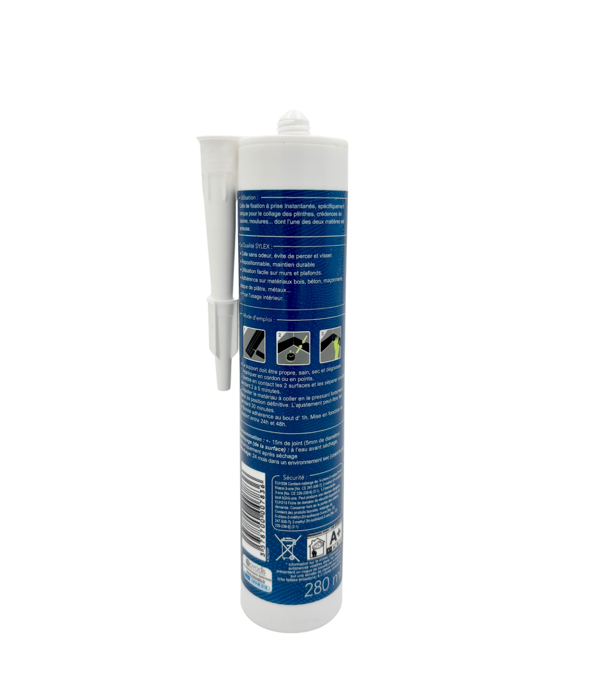 Colle de fixation spéciale plinthes formulée à base acrylate. Sans solvants ni odeurs, cette colle permet de fixer les plinthes sans avoir recours à des clous ou des vis. La prise est immédiate et colle de manière très forte et durable. Cette colle est également adaptée pour le collage de crédences de cuisine, de moulures ou de tout éléments dont l'une des deux matières est poreuse.