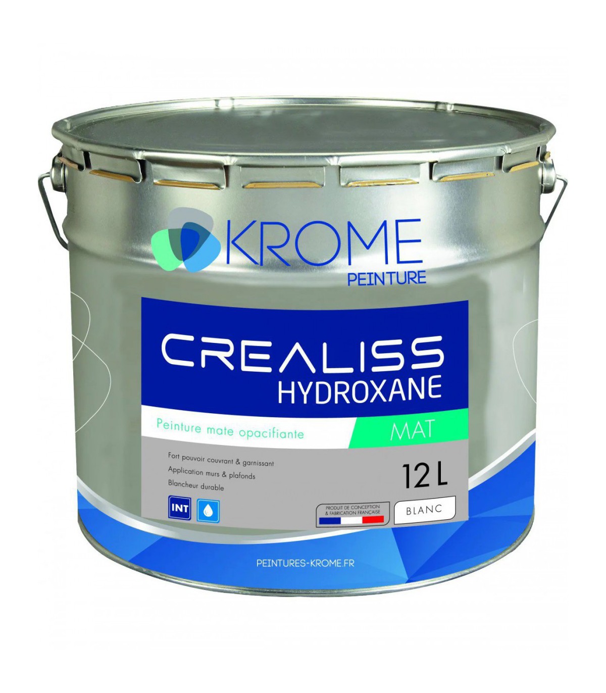 La peinture Krome Crealiss Hydroxane est une peinture mate à base de résine acrylique en phase aqueuse, sans odeur.