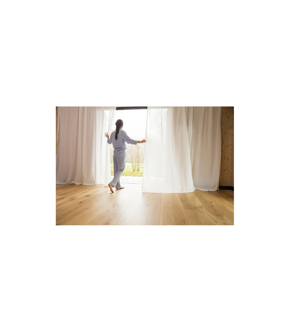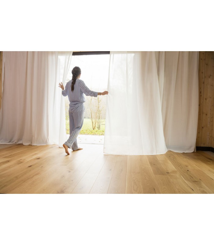 Ce parquet bois se distingue par sa teinte chêne nature lumineuse, mêlant subtilement des nuances ocre et dorées. Il crée une ambiance chaleureuse et accueillante, idéale pour les salons, chambres ou espaces de vie.