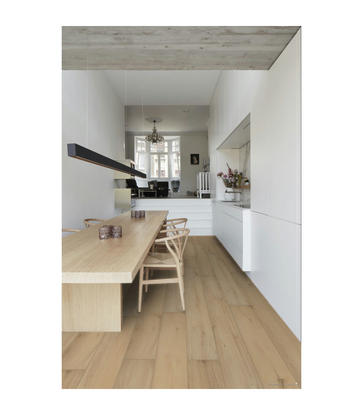 Le parquet stratifié Pacific Gyant Sand Natural se caractérise par une teinte de bois de couleur sable qui s'apparente au pin résineux, une teinte qui s'adaptera facilement à votre décoration d'intérieur. Le parquet Gyant sand natural est souvent utilisé pour créer un contraste avec une pièce aux murs blancs ou en pierre. Il s'associe très bien à des meubles en bois sombre.