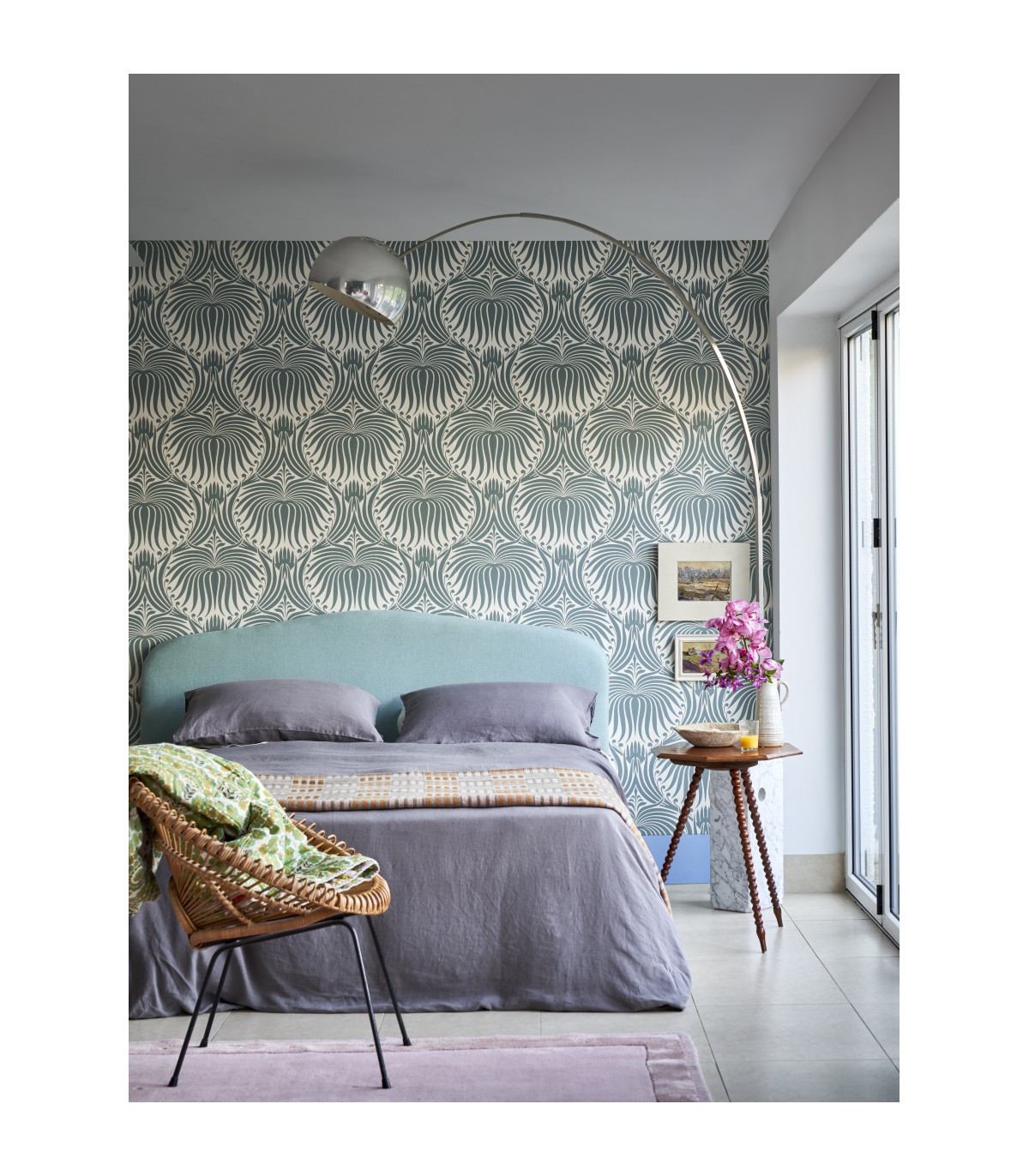 "Inspiré de la période Belle Époque, le motif Lotus apporte une touche vintage élégante typique du XIXème siècle dans les maisons traditionnelles comme contemporaines. Les fleurs qui s’épanouissent au mur sont imprimées directement à partir de peinture Farrow & Ball, ce qui donne cet effet texturé au papier et cette dynamique au motif.