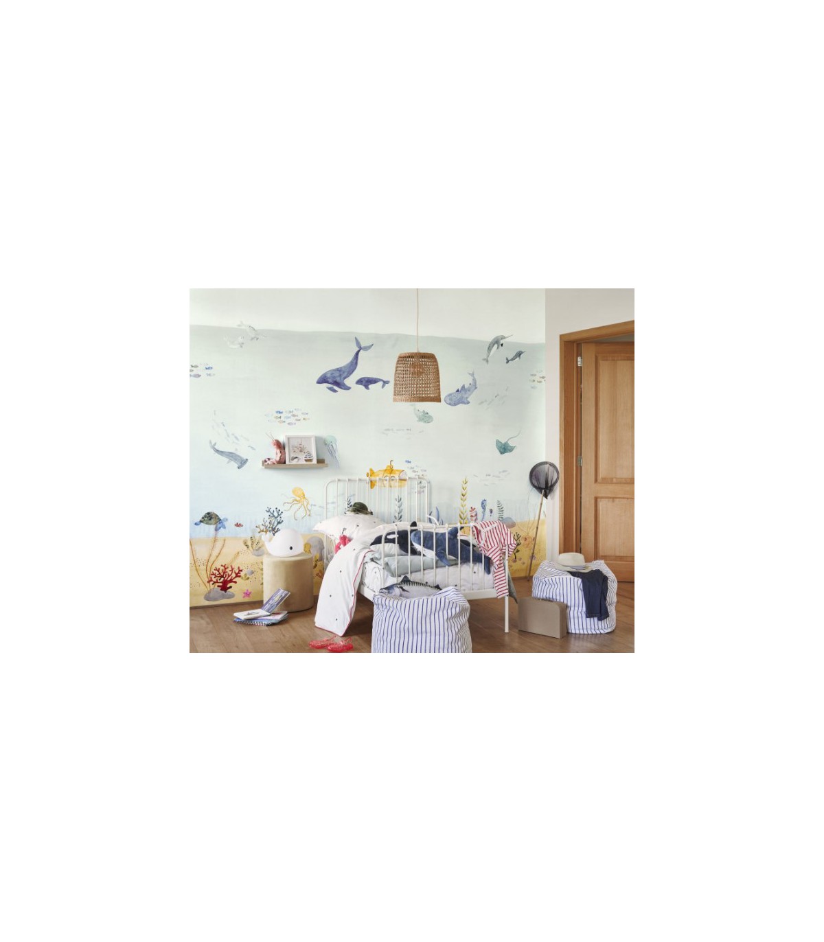 Un panoramique de 3 m de long, le minimum pour exposer toutes les splendeurs des fonds marins ! Cétacés, poissons et crustacés investissent les murs des chambres des petits loups… de mer.