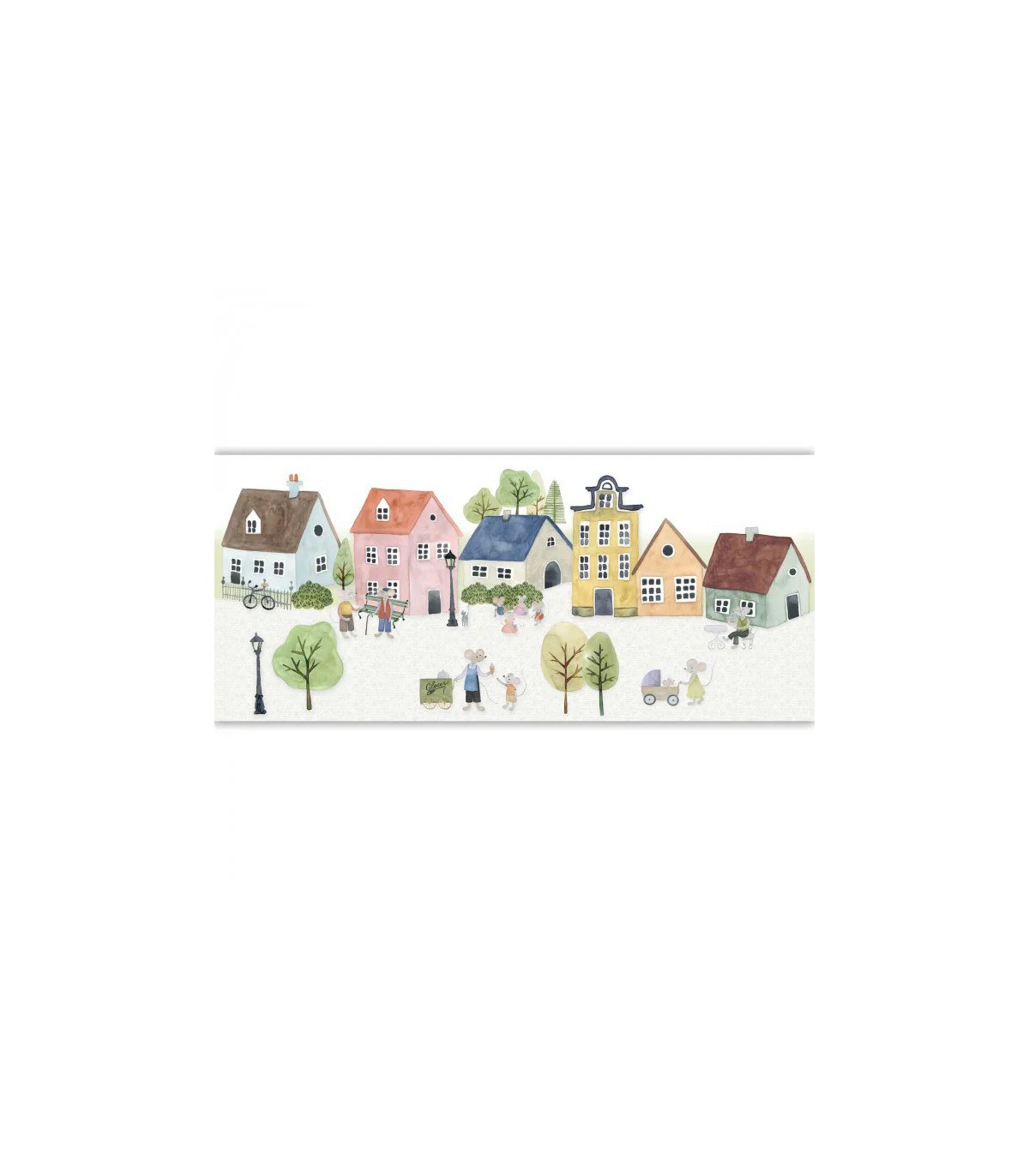 Une frise XL de 50 cm de haut et 4 m de long : c’est le minimum requis pour admirer l’architecture des maisons du village de Souris-Land ! Le long des façades toutes différentes sur 2 mètres de long, on aperçoit des badauds en vélo ou des piétons en promenade. Il fait bon vivre au village…