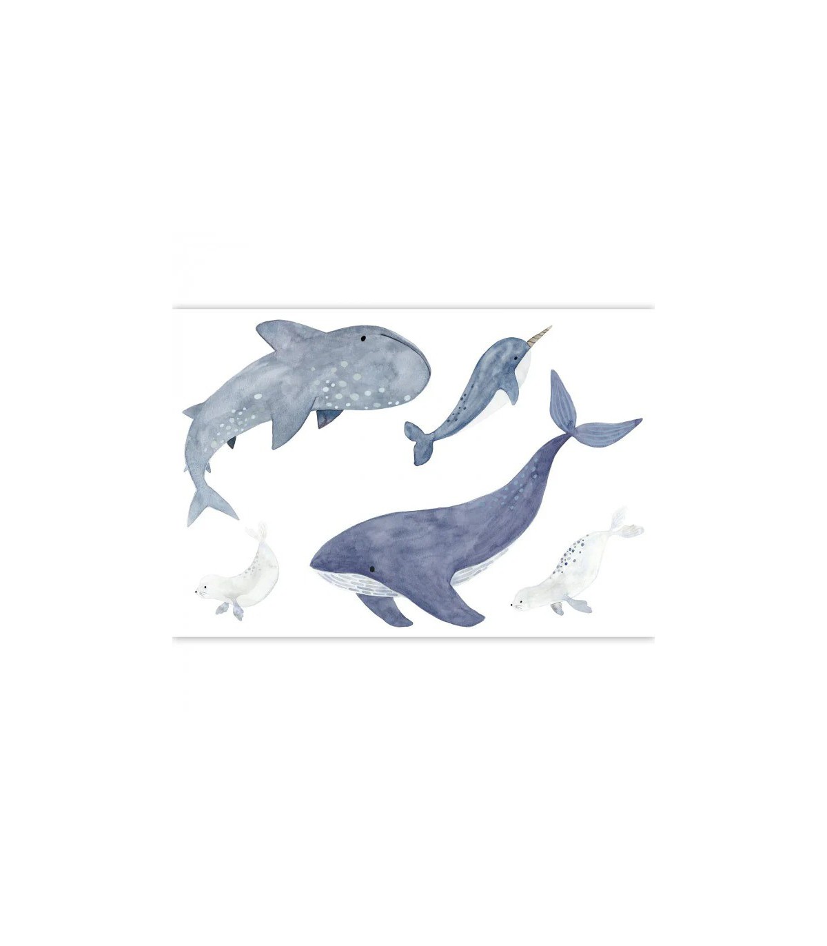 Pré-encollé et pré-découpé, le décor Sea Life invite les grands animaux des fonds, baleine et phoque en tête, sur les murs de la chambre.