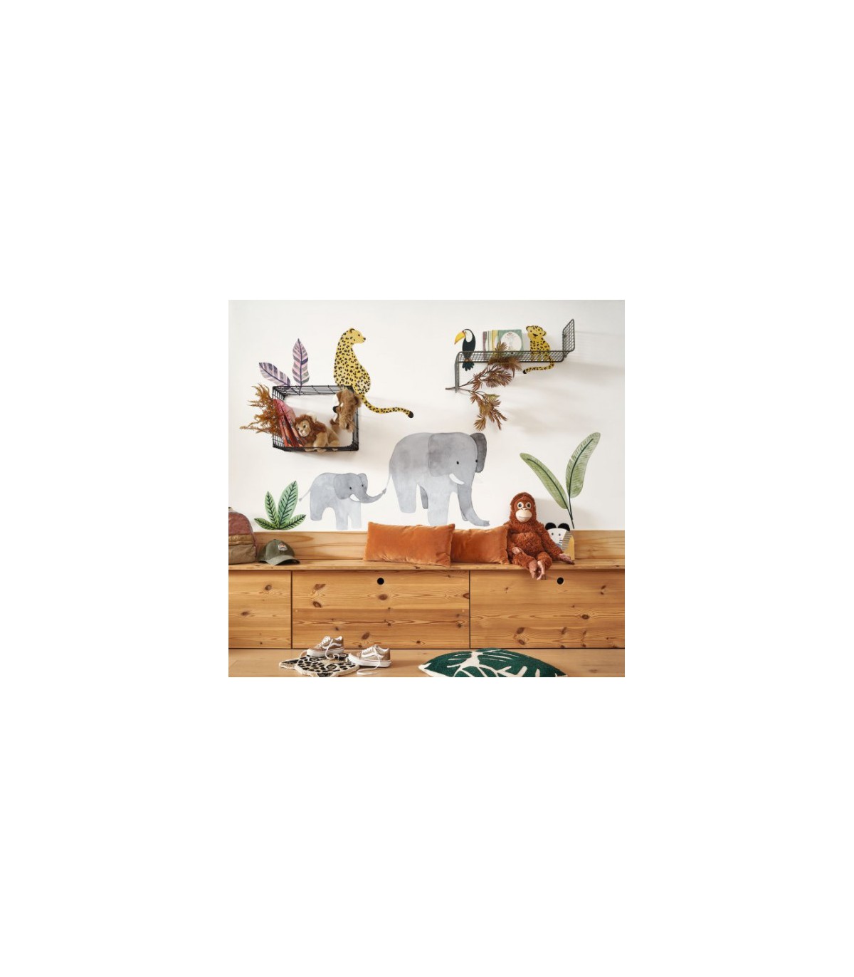 Avec ce duo tout coloré de toucan/ félin, transformez la chambre de votre enfant en maison de Mowgli. Un décor XL espiègle et charmant.