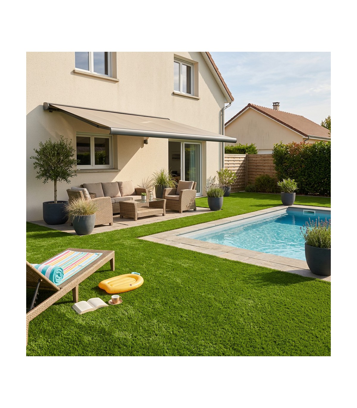 Wembley est parfait pour les grands jardins, les bords de piscine et les espaces publics. Sa résistance à l’usure et sa mémoire de forme des fibres permettent de garder un aspect soigné et dense malgré le passage fréquent.