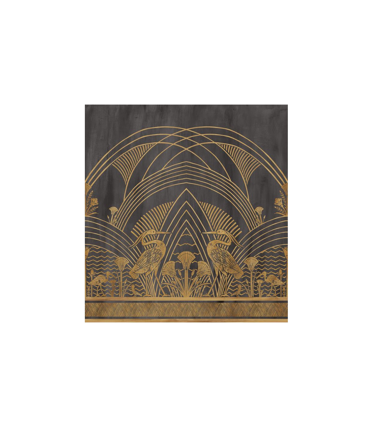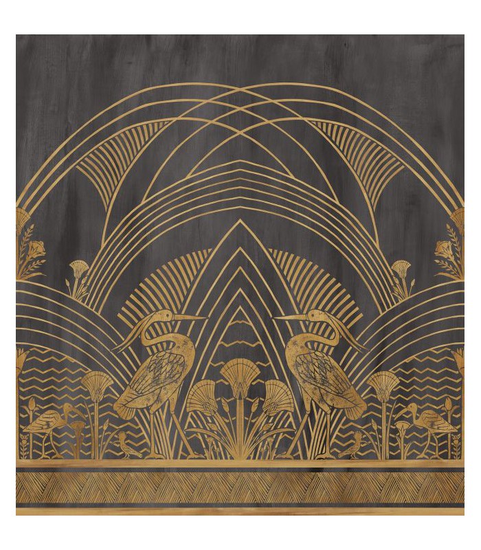 Proche d’une réserve naturelle, l’île Éléphantine abrite ibis et hérons cendrés au coeur d’une luxuriante palmeraie. Aux confins de l’iconographie égyptienne et de la composition Art déco, ce panoramique représente des hérons dans un effet de miroir. Inspiré de l’Égypte antique, Éléphantine a été réalisé par le studio de création de Casamance. Des tampons gravés à la main, trempés dans l’encre puis apposés confèrent à la composition un aspect vieilli, révélant de précieux effets de matière. Composé de quatre lés et imprimé en digital sur une base métallisée le panoramique se déploie sur une largeur de 280 cm. Il est proposé en deux versions : l’une sur fond blanc, l’autre sur fond noir.