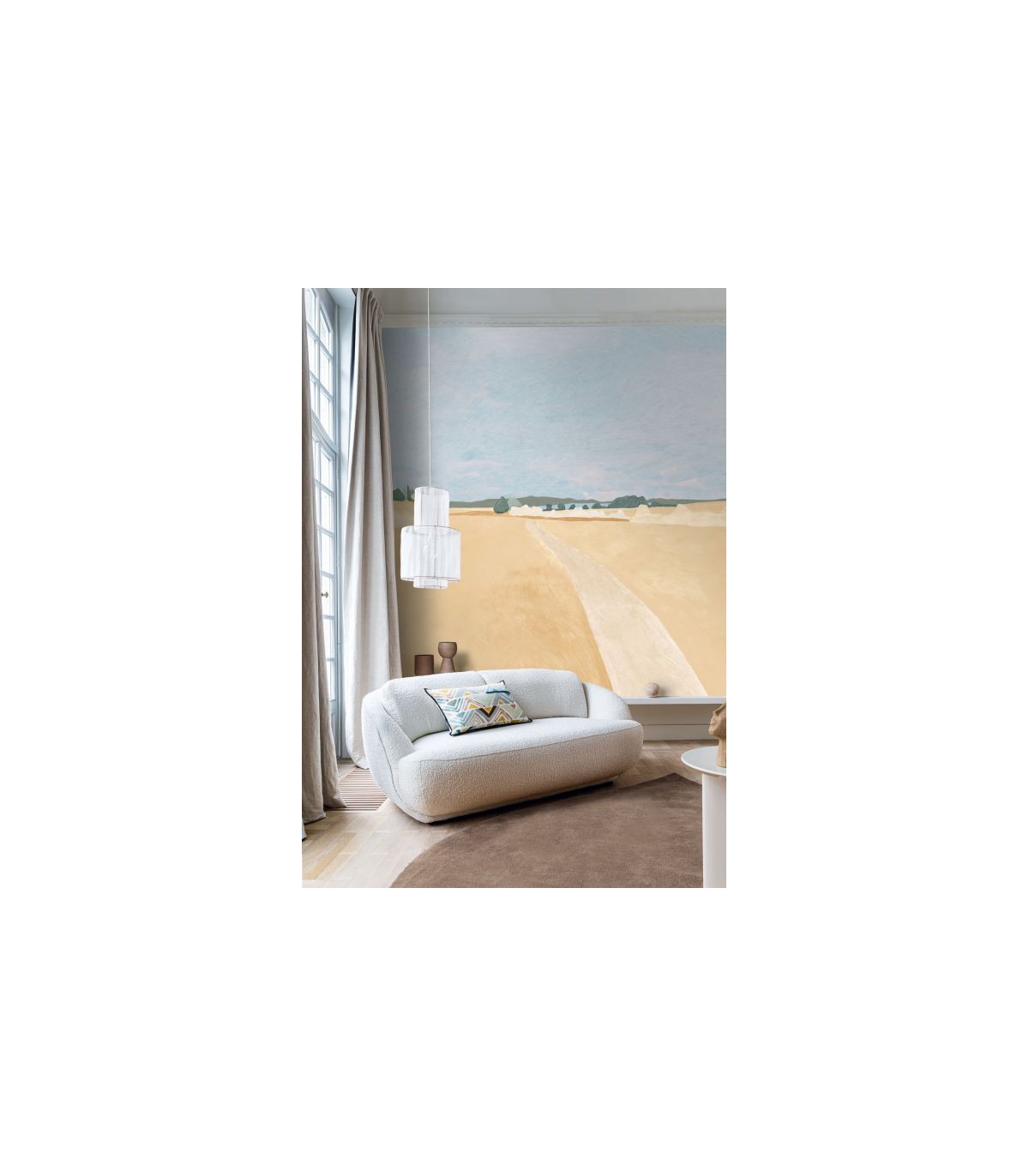 Un sentiment d’immensité palpable... Le sillon tracé dans un champ de blé invite à l’évasion. MOISSON est proposé en deux versions, l’une de jour et l’autre au coucher du soleil. L’aspect fibreux du papier confère de la matière au dessin, réalisé au pastel gras et au crayon de couleur.