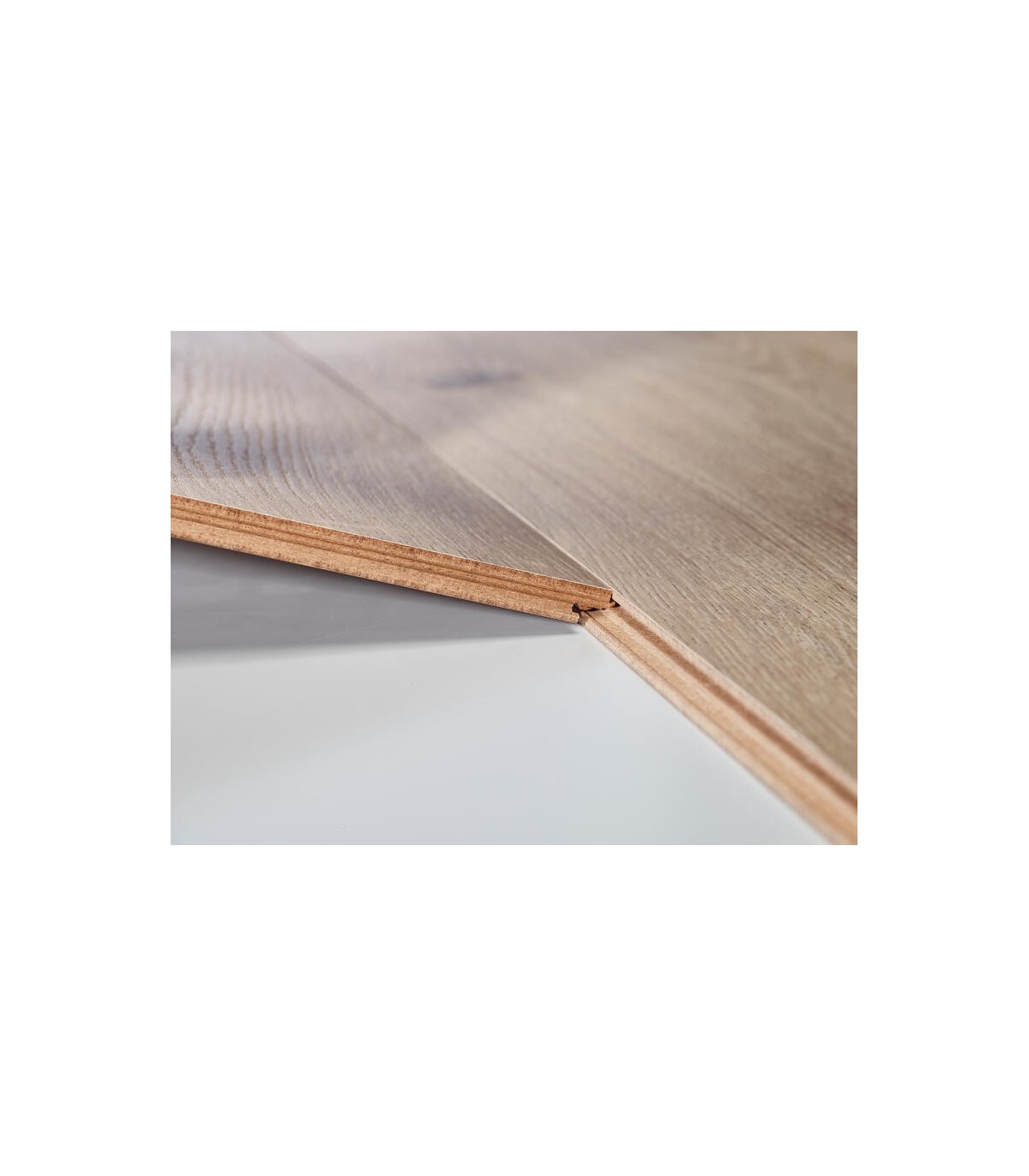 Avec ses lames de 1288 mm x 190 mm, le parquet stratifié 8V4 crée un effet visuel spacieux et homogène. Les 4 chanfreins soulignent chaque lame, renforçant l’impression de parquet massif. Un chanfrein est une petite coupe en biseau effectuée sur le bord du parquet stratifié, qui permet de clipser les lames entre elles. Ce format allie élégance et confort sous le pied.